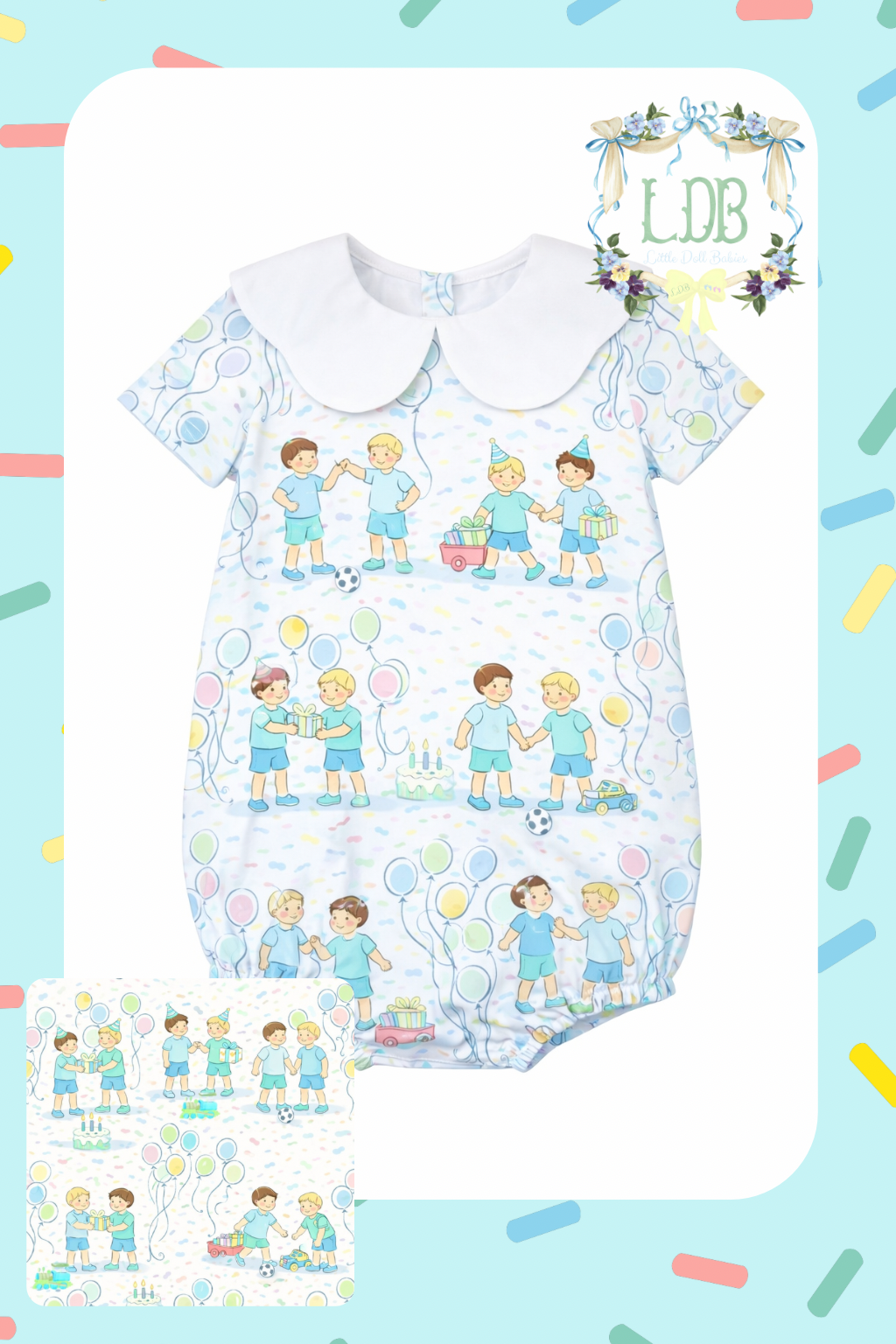 Celebrate your little one’s big day in the sweetest style with our Birthday Bash Bubble. This playful piece features an adorable birthday-themed print filled with balloons, gifts, cake, and cheerful little friends celebrating together.