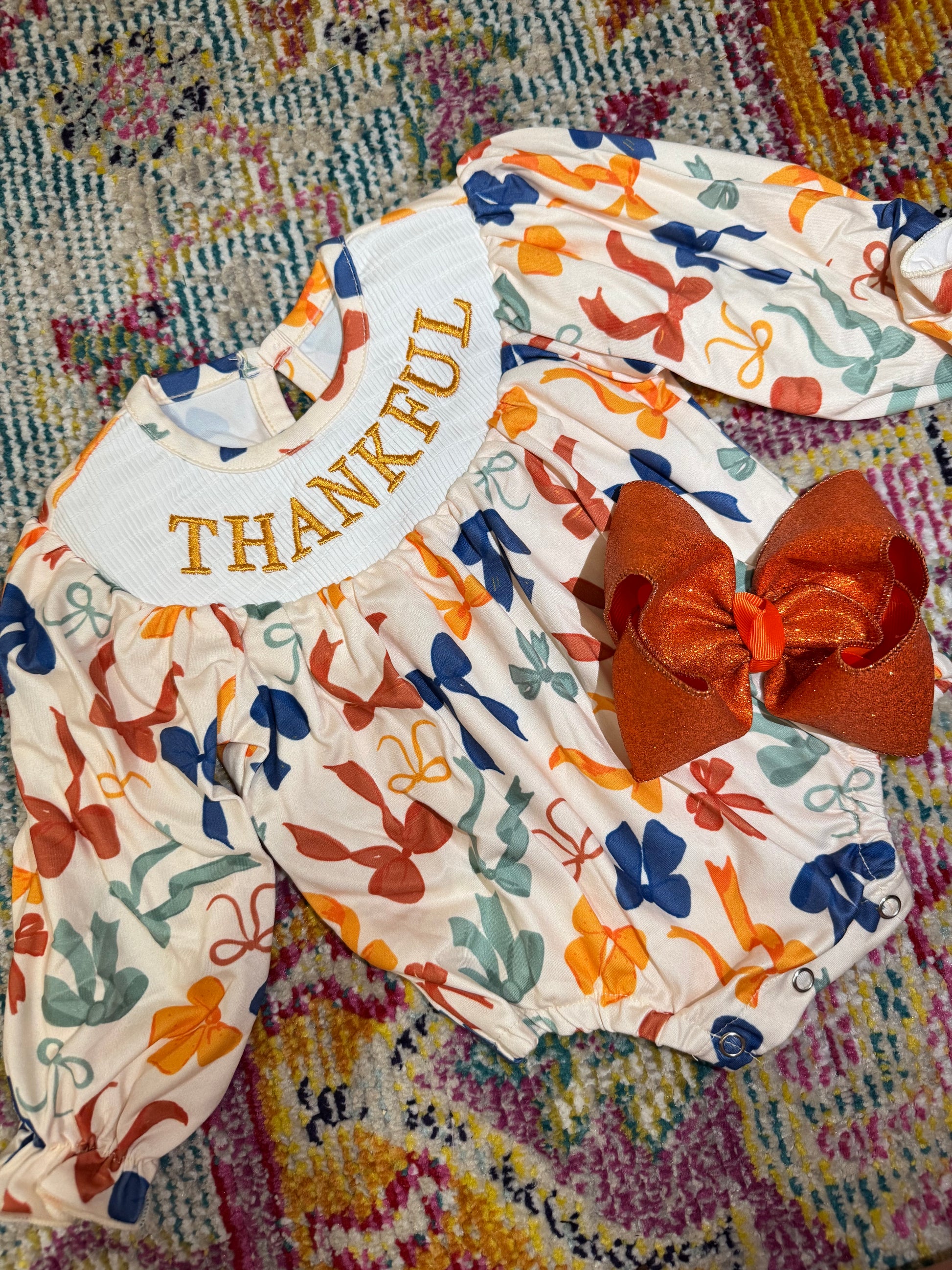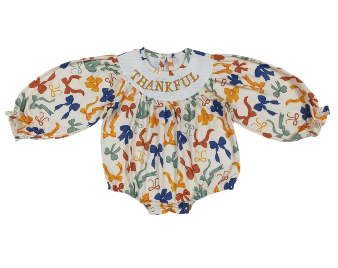 Get your little girl ready for Thanksgiving with our Counting My Blessings outfit. This fall-inspired bubble features a smocking plate that reads "thankful", reminding us of the true meaning of the holiday. Make memories and give thanks with this adorable and meaningful outfit.