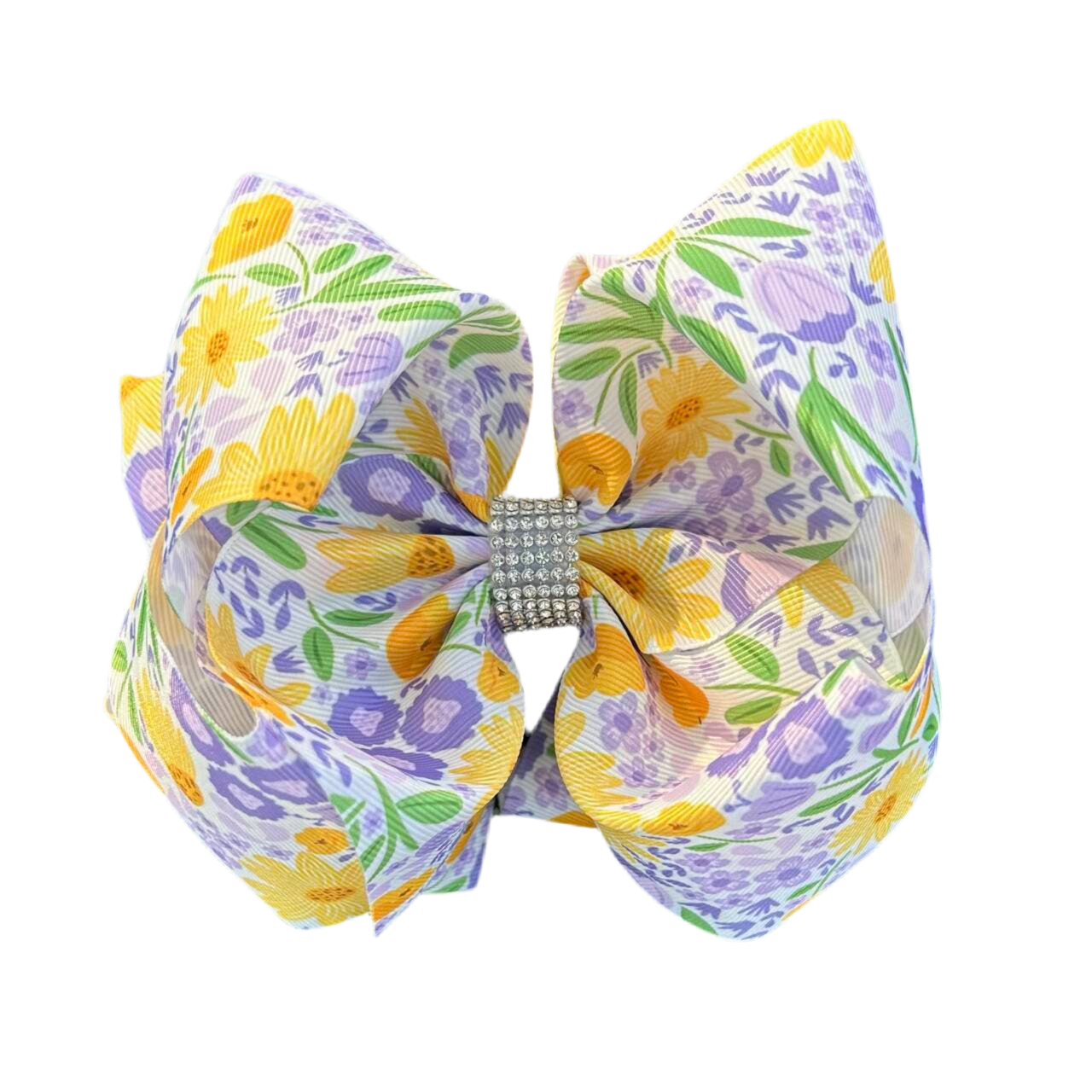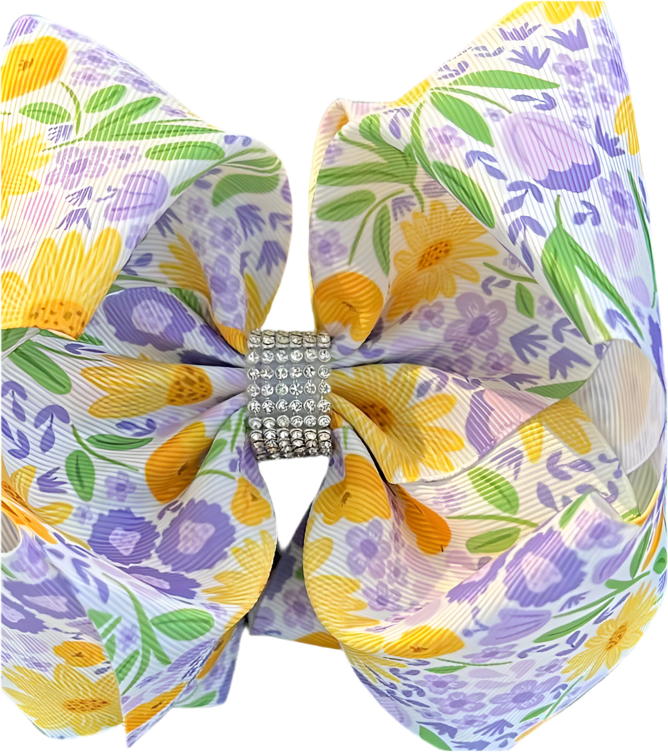 Green, yellow and purple floral printed double layer hair bows measure 6.5" wide. Each bow features intricate rhinestones, adding a touch of elegance to any hairstyle. The alligator clip ensures a secure hold for all-day wear. Perfect for adding a pop of color and style to your outfit.