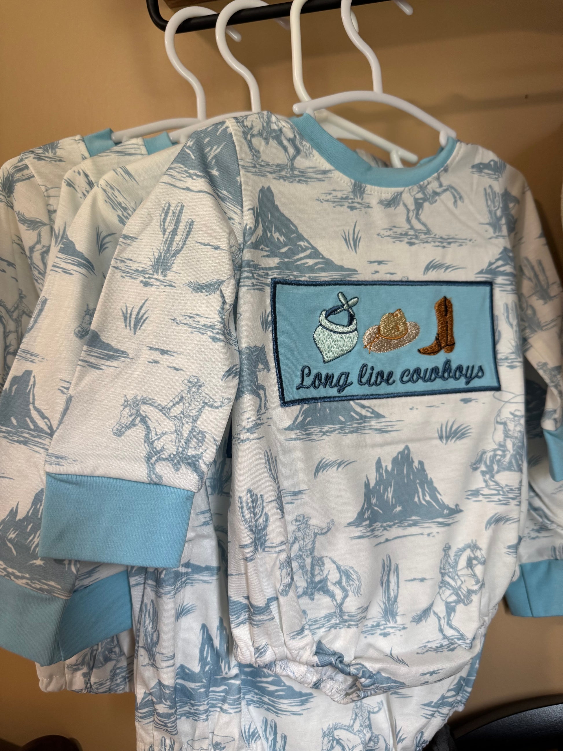 Ride off into the sunset in style with our Long Live Cowboys outfit, beautifully embroidered with a cowboy hat and boots. This outfit will keep you looking sharp and rugged on the ranch. Yeehaw!