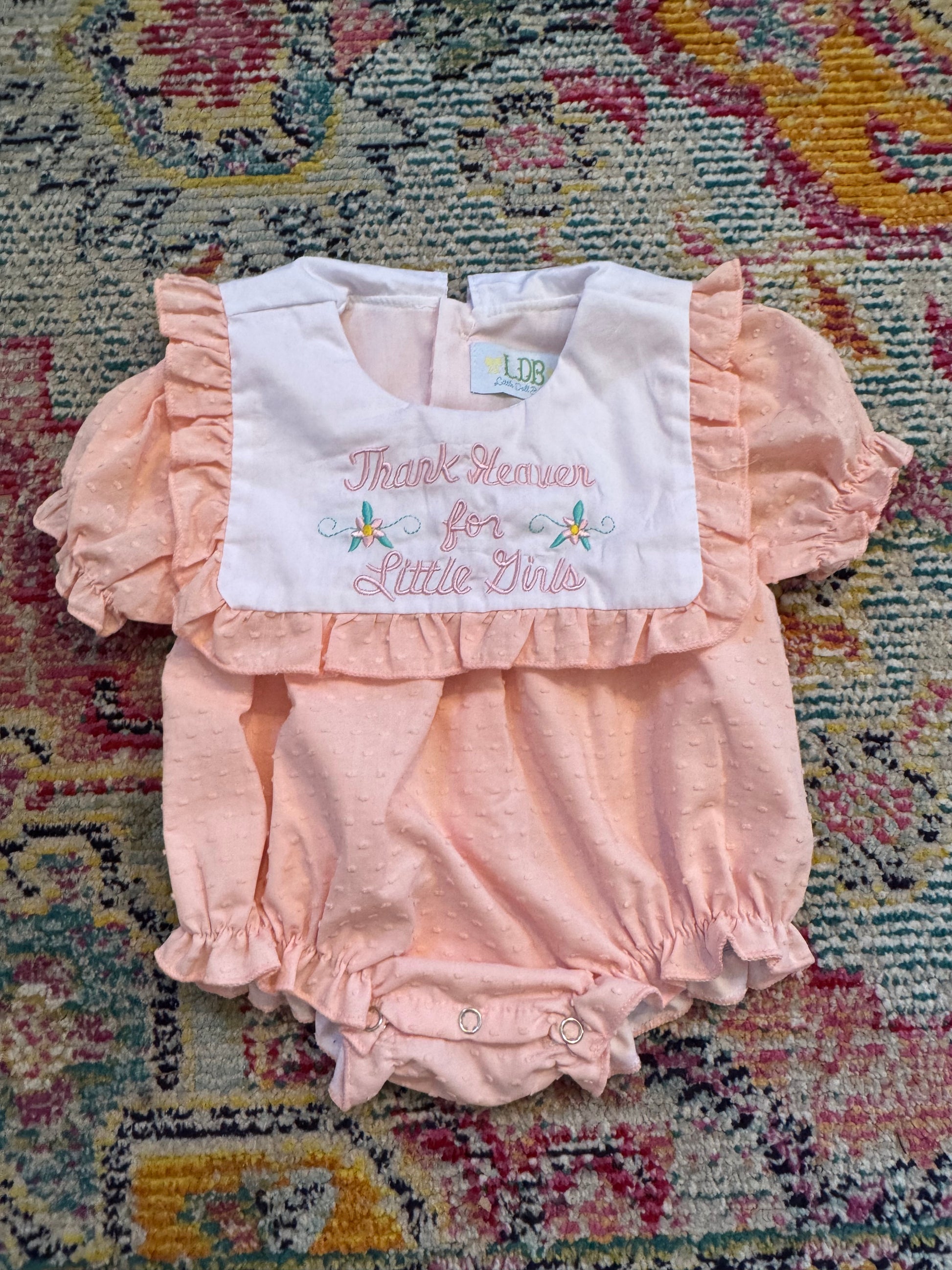 Celebrate your little boy with this sweet Swiss dot bubble featuring the embroidered phrase "Thank Heaven for Little Boys". Made with delicate fabric and a thoughtful message, this bubble is perfect for your little bundle of joy. Cherish every moment with Thank Heaven for Little Boys.
