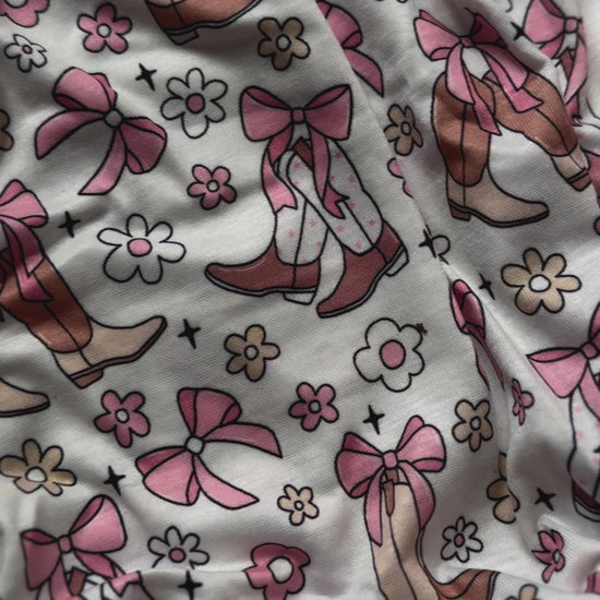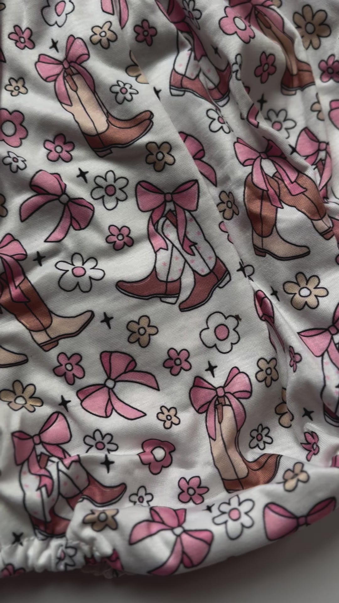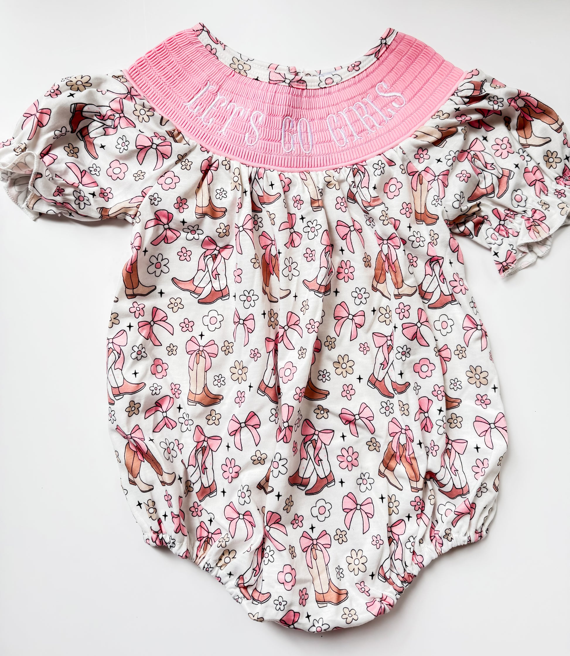 Get ready to hit the town with "Let's Go Girls" embroidered on this adorable bubble! The smocked plate is decorated with boots and bows, perfect for your little fashionista. Get ready to turn heads and have some fun!